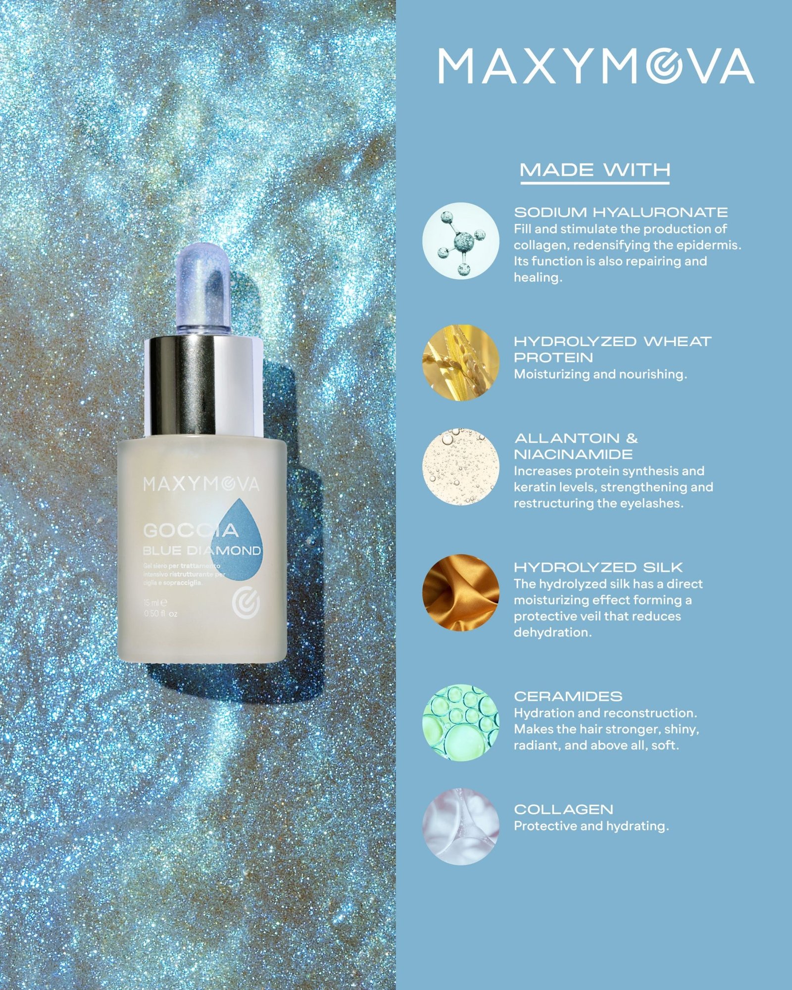 Goccia Blue Diamond е реструктуриращ серум, създаден да подхранва, хидратира и придава допълнителен блясък на миглите и веждите.